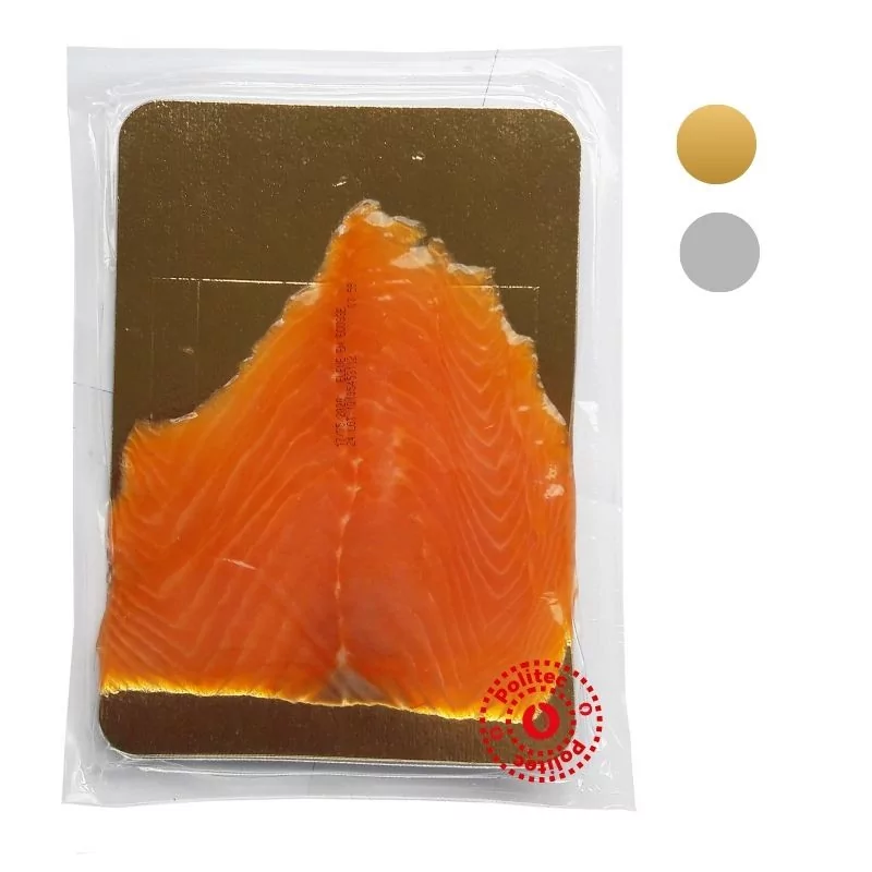 Plaques cartonnées or et argent avec coins arrondis (750 gr/m²). Idéal saumon fumé entier.