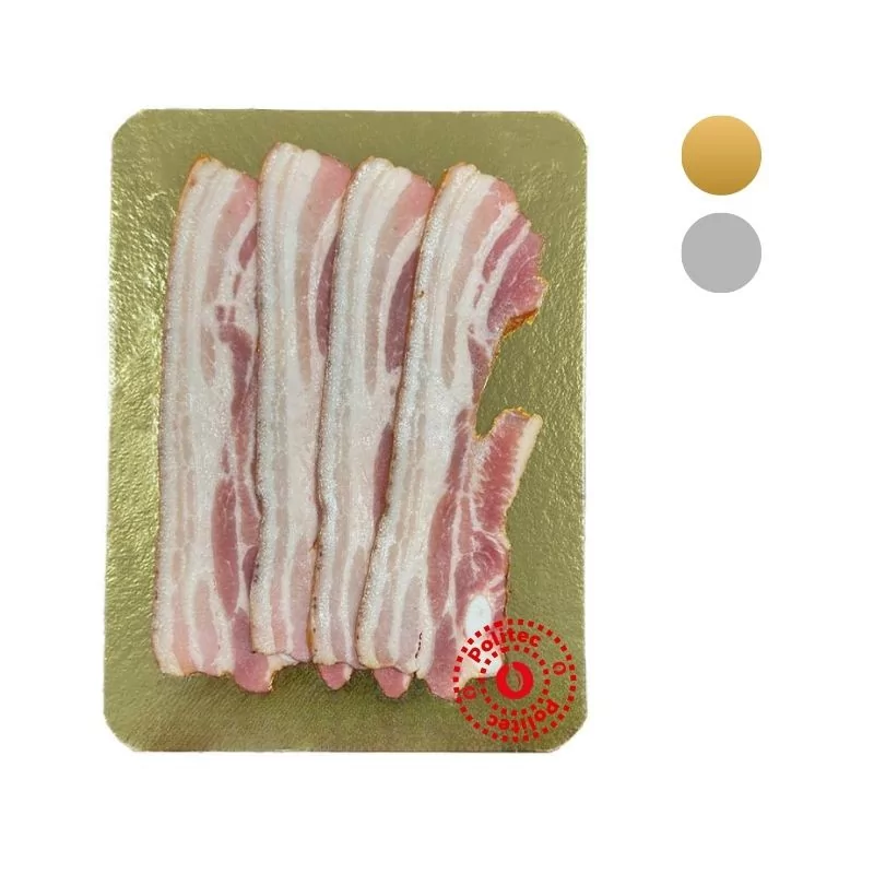 Plaques cartonnées or et argent avec coins arrondis (750 gr/m²). Idéal saumon fumé, magret, foie gras.