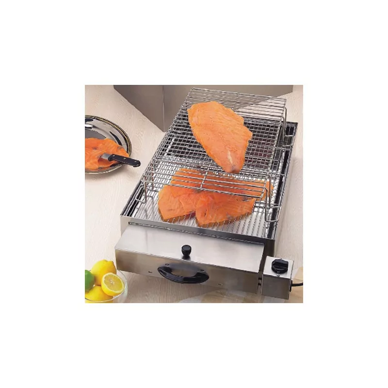 + infosUn grand fumoir professionnel de table en inox avec 2 grandes grilles pour le fumage à la sciure de bois des produits à poser.