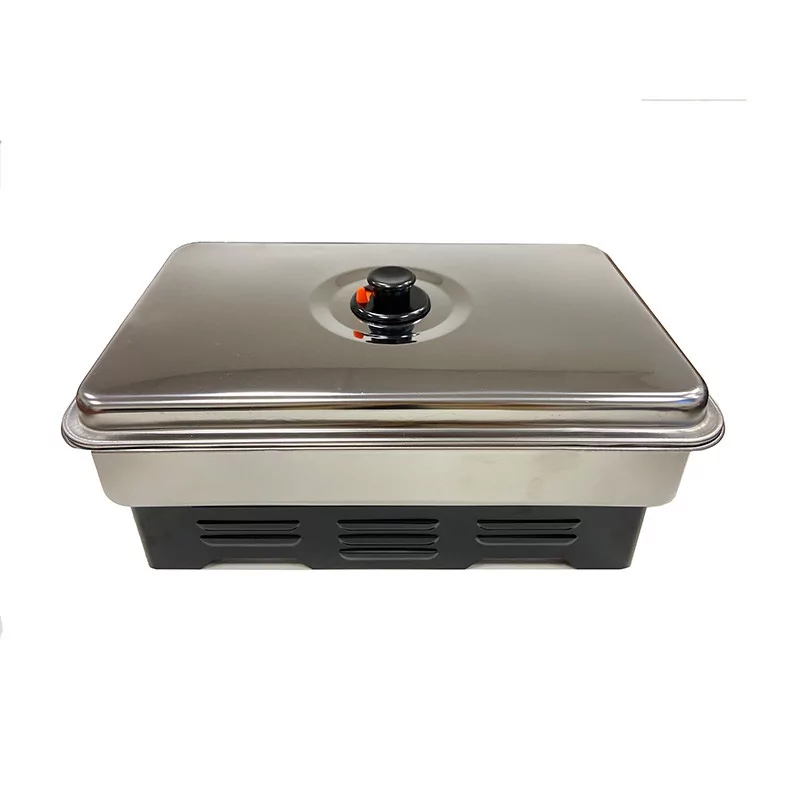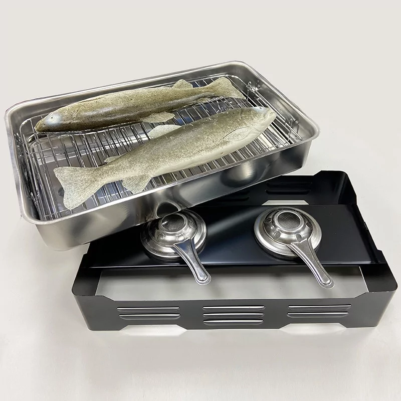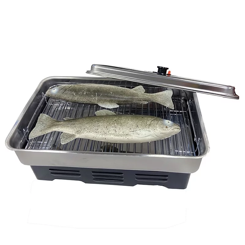 Un petit fumoir inox à la sciure de bois conçu pour le fumage à chaud uniquement, les aliments sont simultanément cuits et fumés.